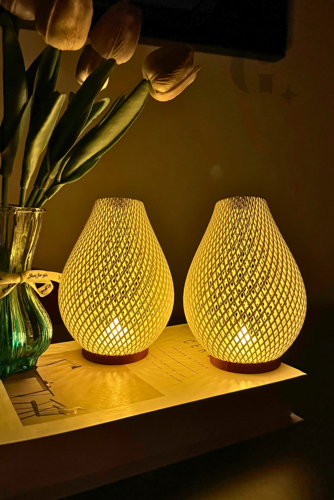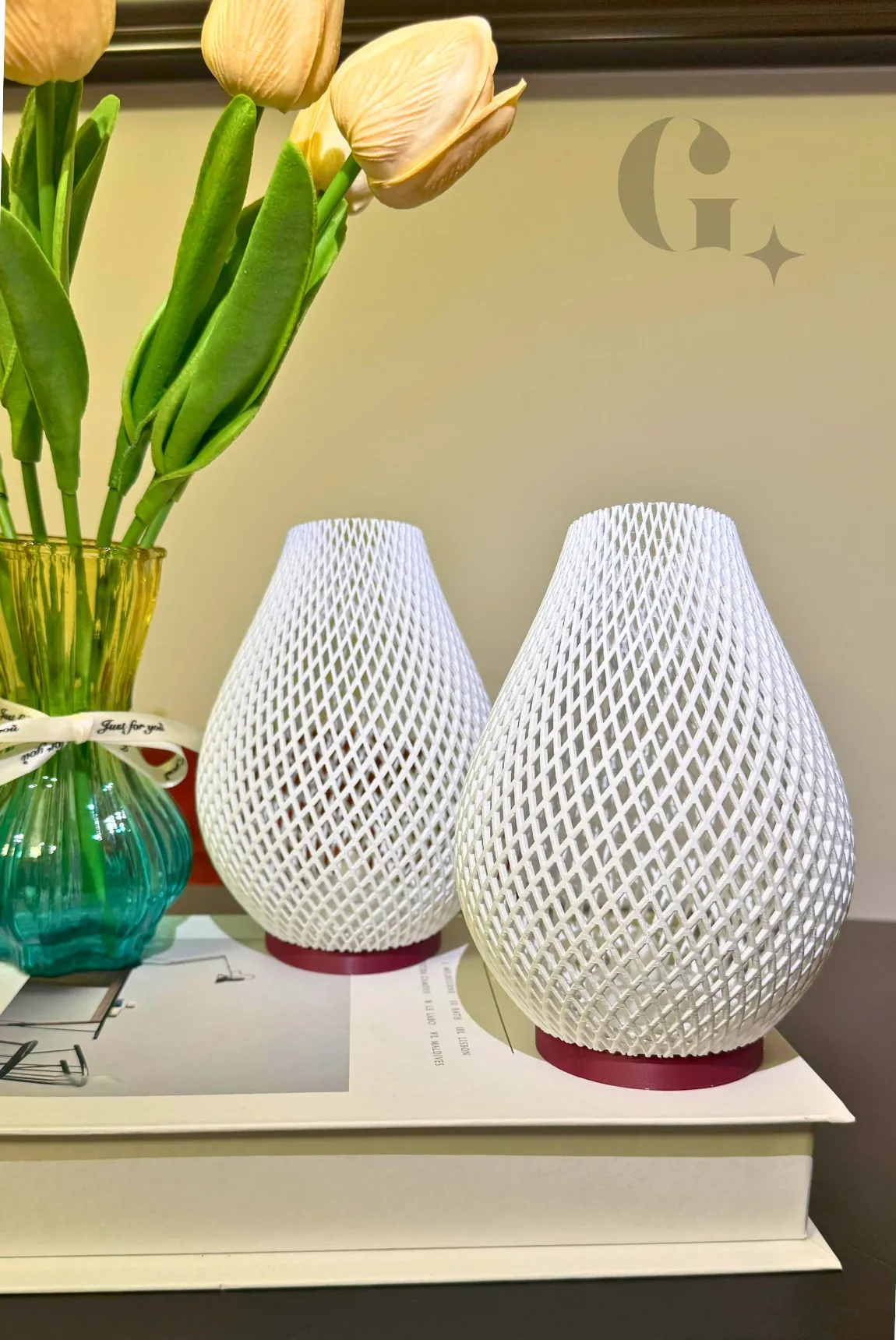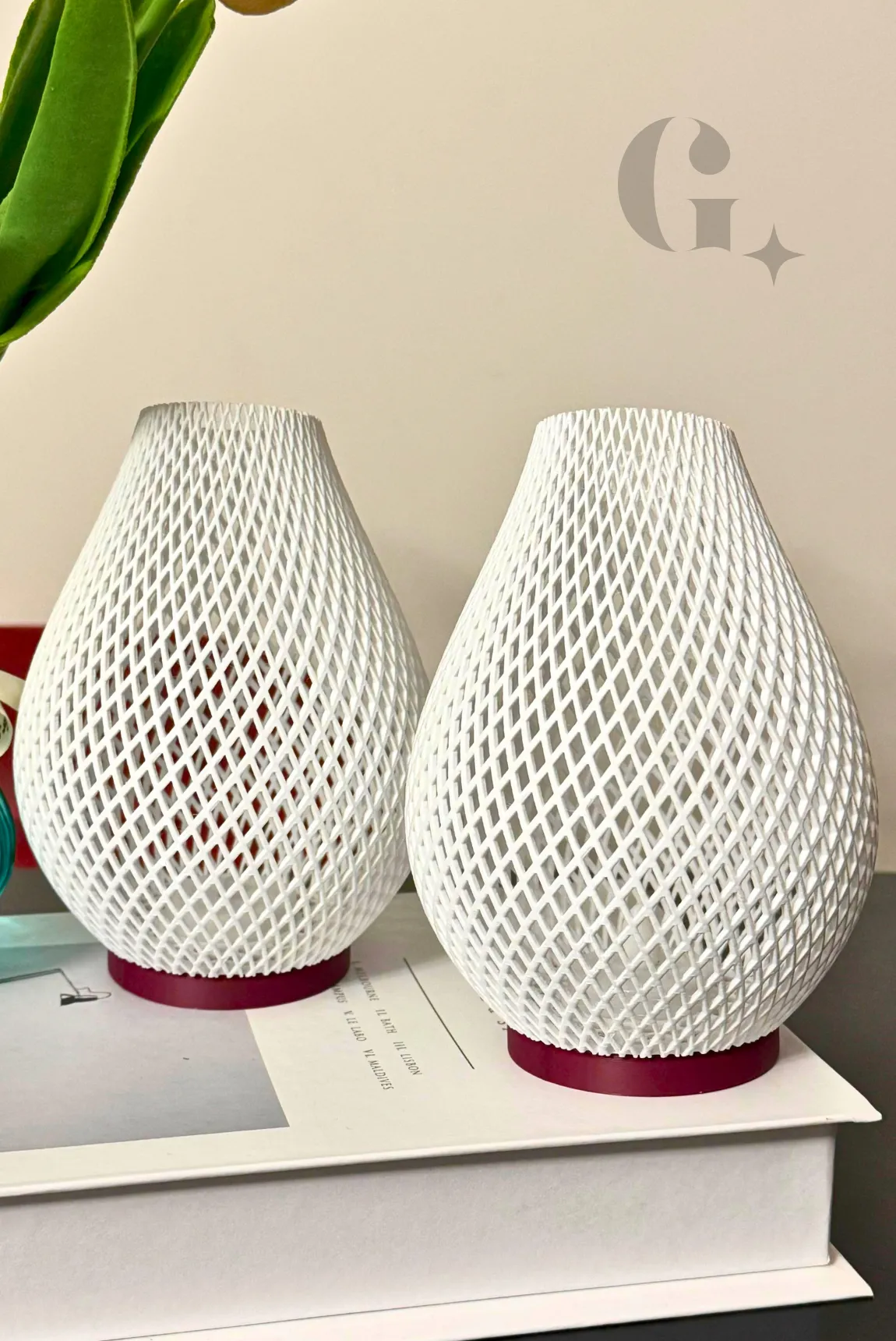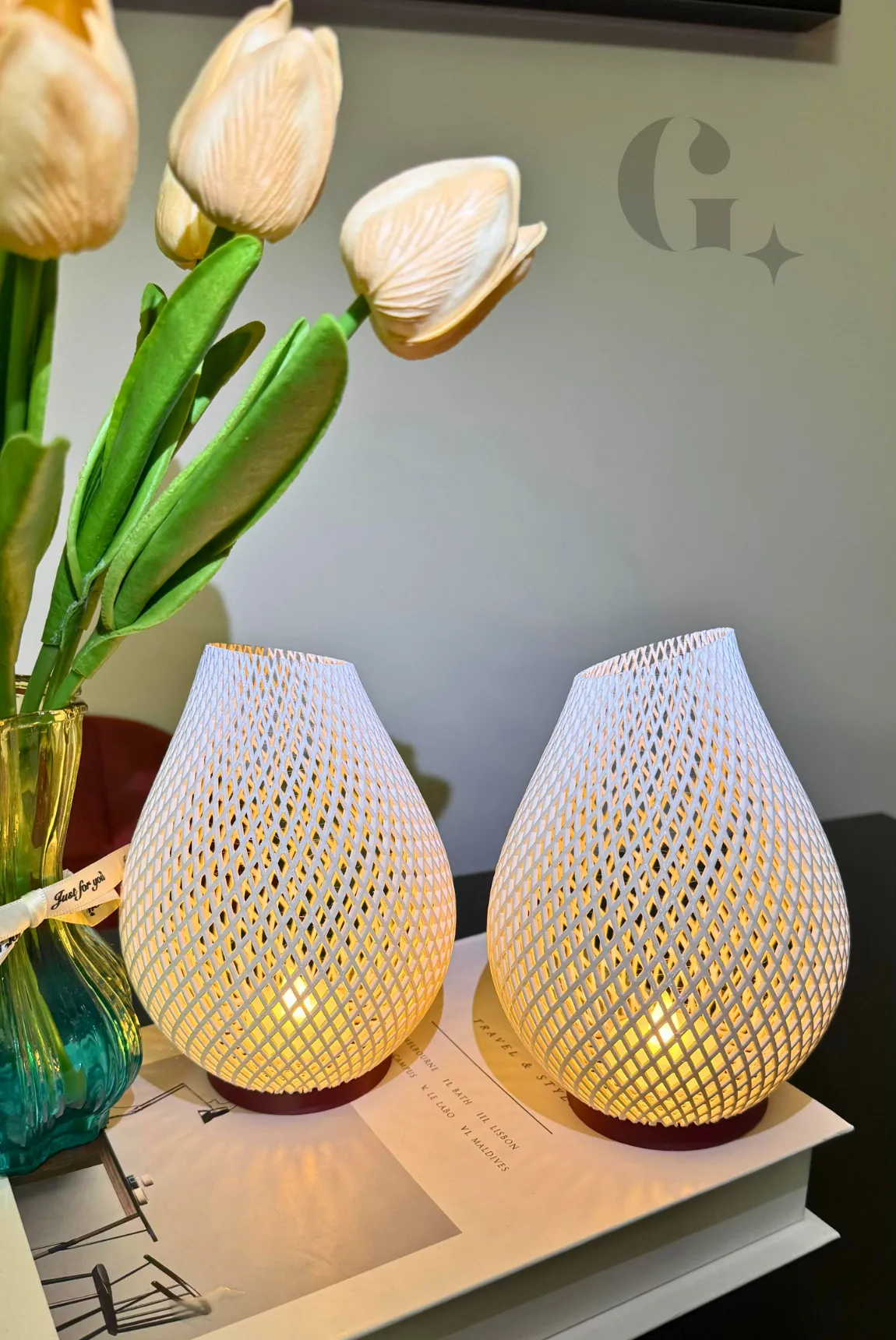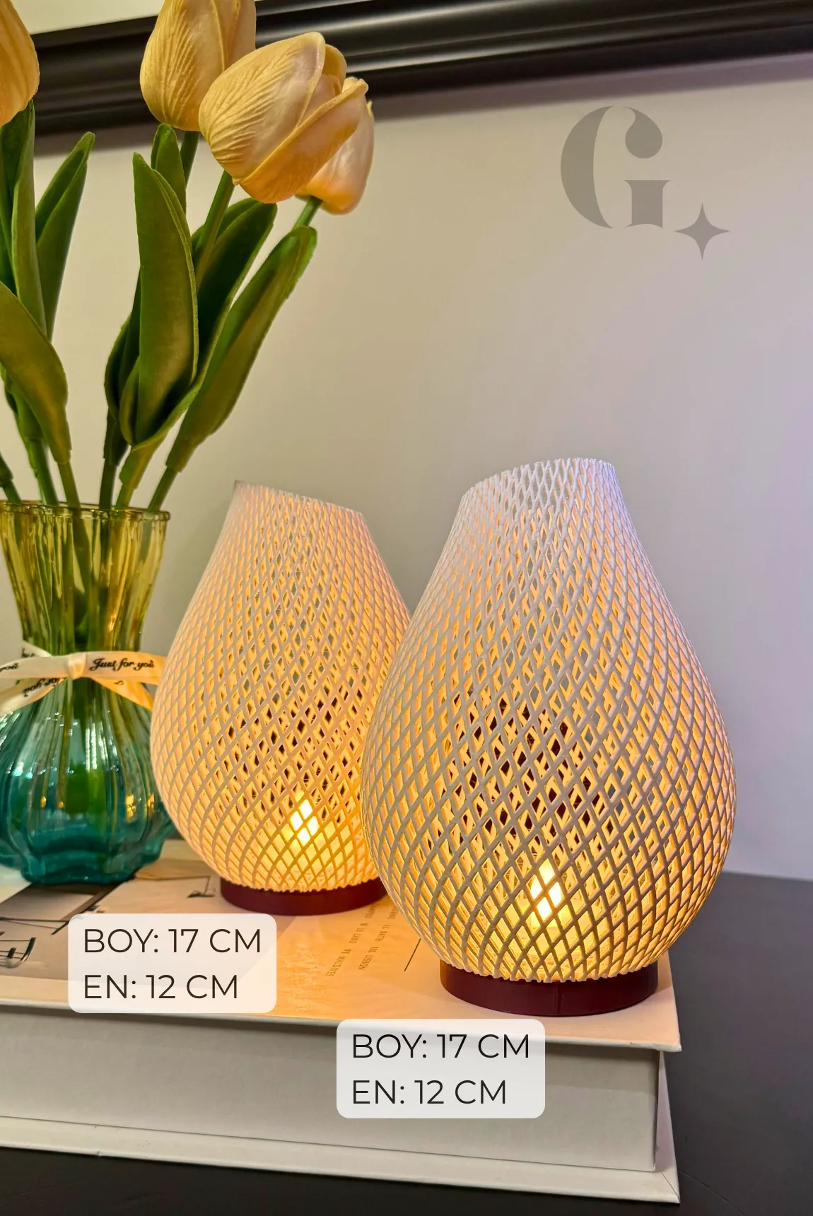 Şık ve modern tasarımıyla öne çıkan dekoratif objemiz aydınlatma özelliği ile birlikte gelir. Ürünümüz doğada çözünen biyopilastik türü PLA’dan üretilmiş olup LED ışık ve pilleri ile birlikte gönderilmektedir. 17 cm yüksekliğinde ve 12 cm genişliğinde olan bu ikili set, sıcak ışık tonlarıyla ortama huzur katarken, estetik bir dokunuş sağlar.